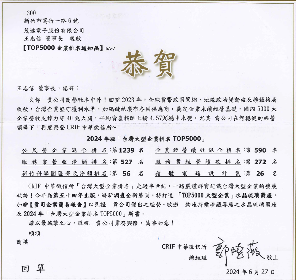 Ranked 26th in the IC design industry among the 2024 Top 5000 Large Enterprises in Taiwan by China Credit Information Service Ltd.