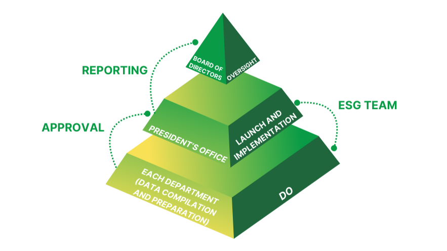 ANPEC has established a “Sustainable Development Best Practice Principles”, and formed an “ESG Group” composed of representatives from the President’s Office and various departments. The ESG Group is led by the Executive Vice President, who serves as the convener. Together, they collaboratively promote matters related to sustainable development. A quarterly report on the progress of GHG inventory and verification is regularly submitted to the Board of Directors. In addition, the overall implementation status of sustainable development is reported to the Board of Directors at the end of each year. In 2024, the Board of Directors approved the internal control system for sustainability information management, thereby strengthening the Board’s supervisory mechanism over sustainability-related information. At the same time, the Company officially started the preparation of the sustainability report in 2024. The Sustainability Report Preparation Team is responsible for compiling and editing the report, which is then reviewed and revised by the department heads of the preparation team. Afterward, it will be submitted to the President and Chairman for review, and once approved by the Board of Directors, the final version will be published. ANPEC, along with its governance body, continues to monitor international trends, customer and supplier demands, and government-released climate change information. In order to more effectively manage the potential impact of climate change and sustainability supply chain issues on operations, the Company will continuously review, assess, and adjust its climate sustainability governance policies.
